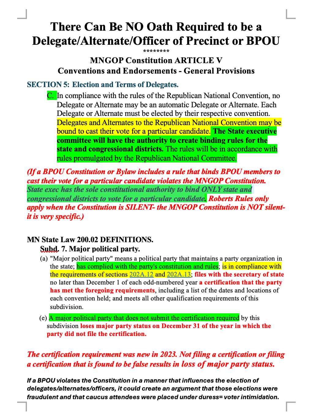 - Require an oath to new delegates, of any kind, for example that they will have to abide by party endorsements. (This violates the MNGOP Constitution, see image/file below)