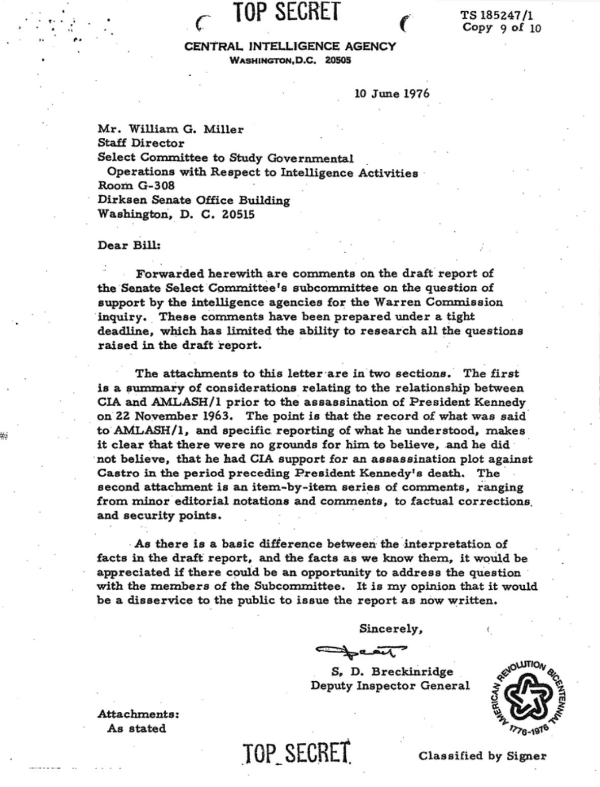 — S.D. Breckinridge regarding the relationship of AMLASH/1 and the CIA prior to the assassination of President Kennedy on 22 November 1963