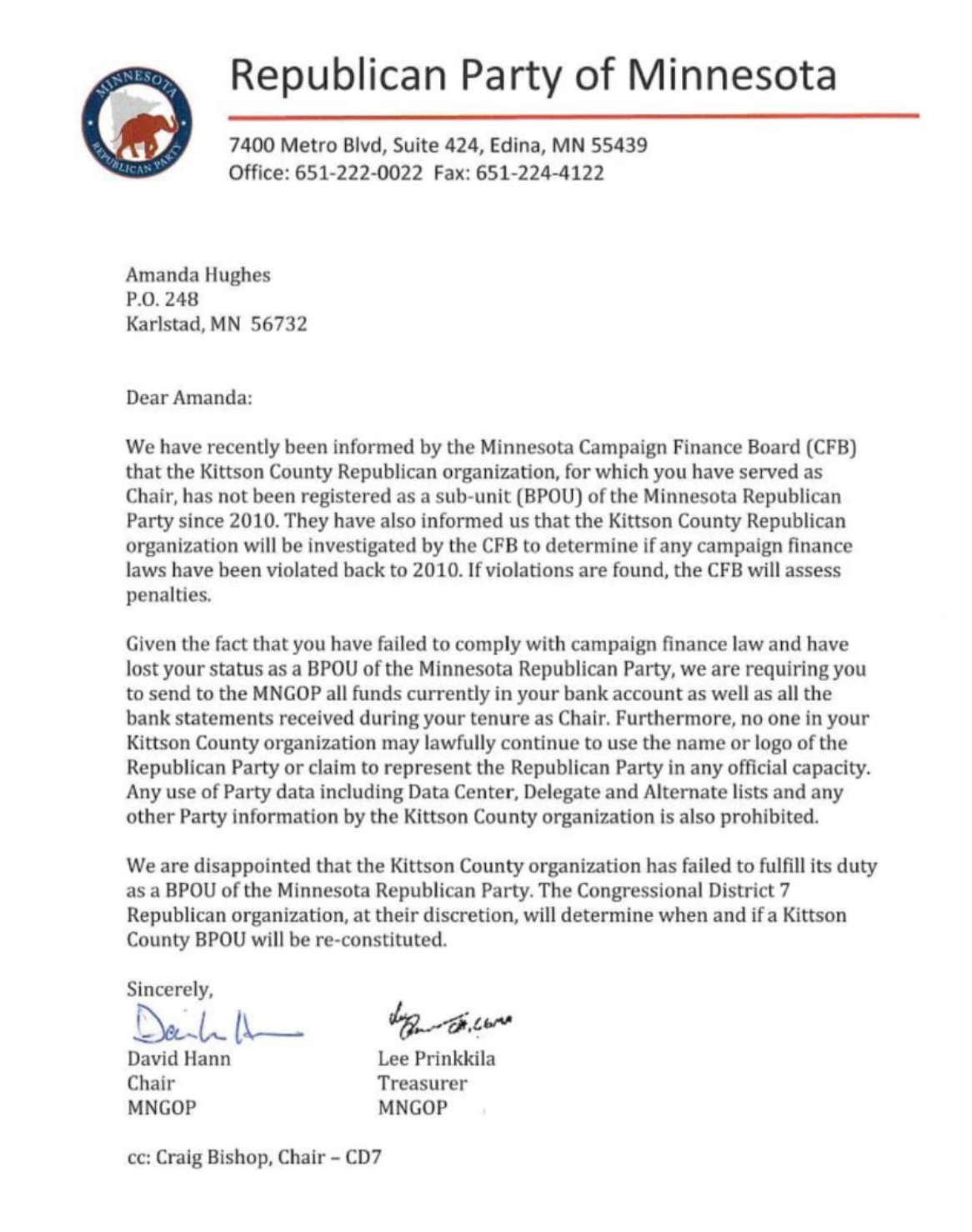 A letter signed by Chair David Hann and Treasurer Lee Prinkkila suggests that the Kittson County BPOU is out of compliance with the Campaign Finance Board and has therefore lost its status as a BPOU (basic political organizing unit).