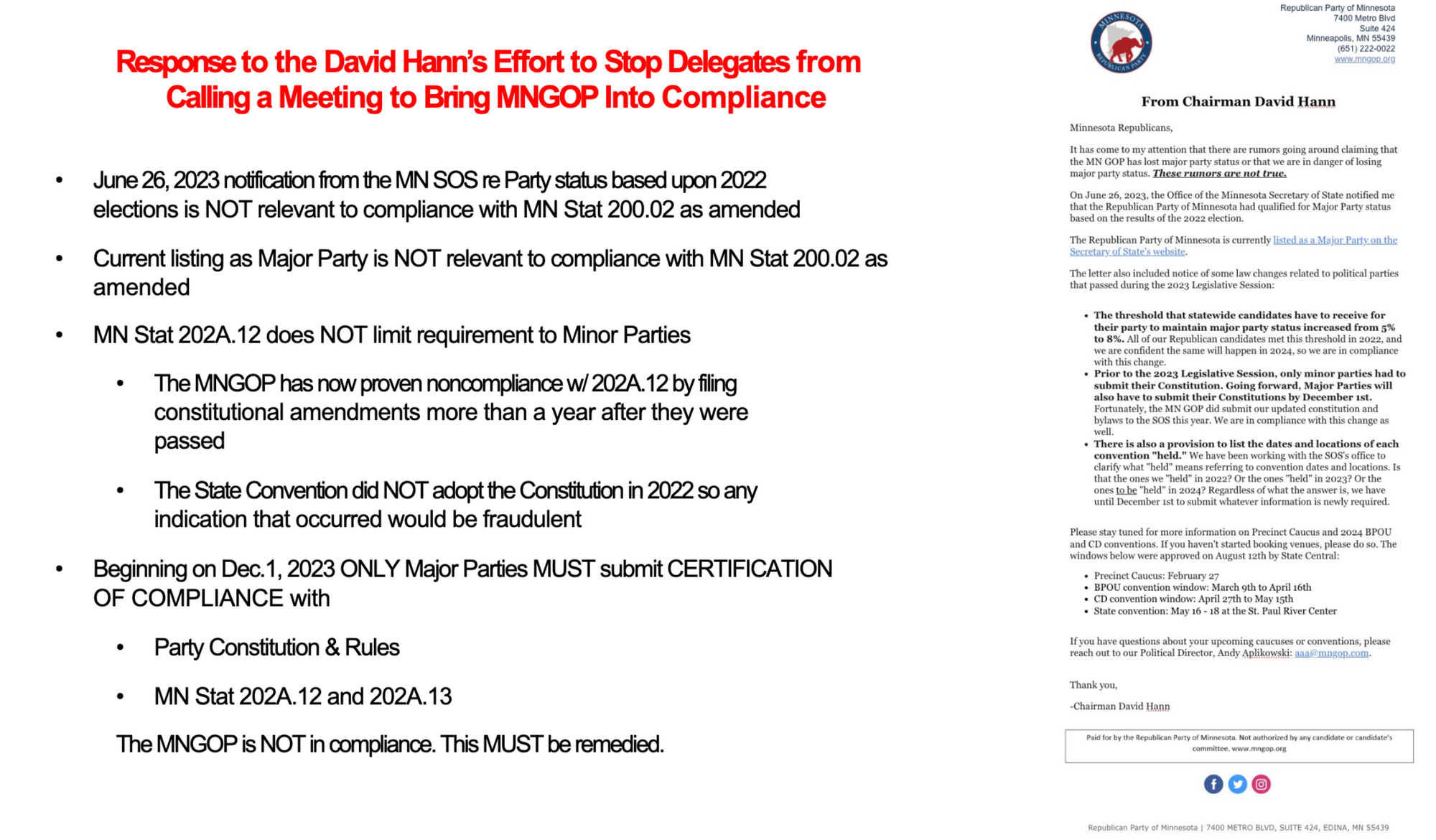 After a meeting of about 70 delegates, legislators, and other interested people on the topic at hand, there is a narrative (supported by Chair Hann as shown in Point 11, but not only him) that the MNGOP is somehow already in compliance or that this particular statute would not be enforced upon the MNGOP. It is unclear how anyone has arrived at this conclusion.