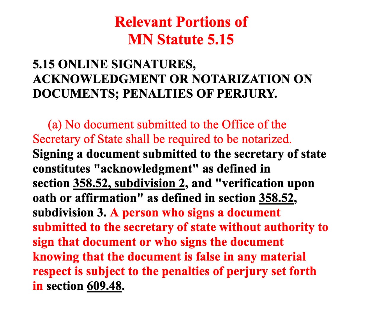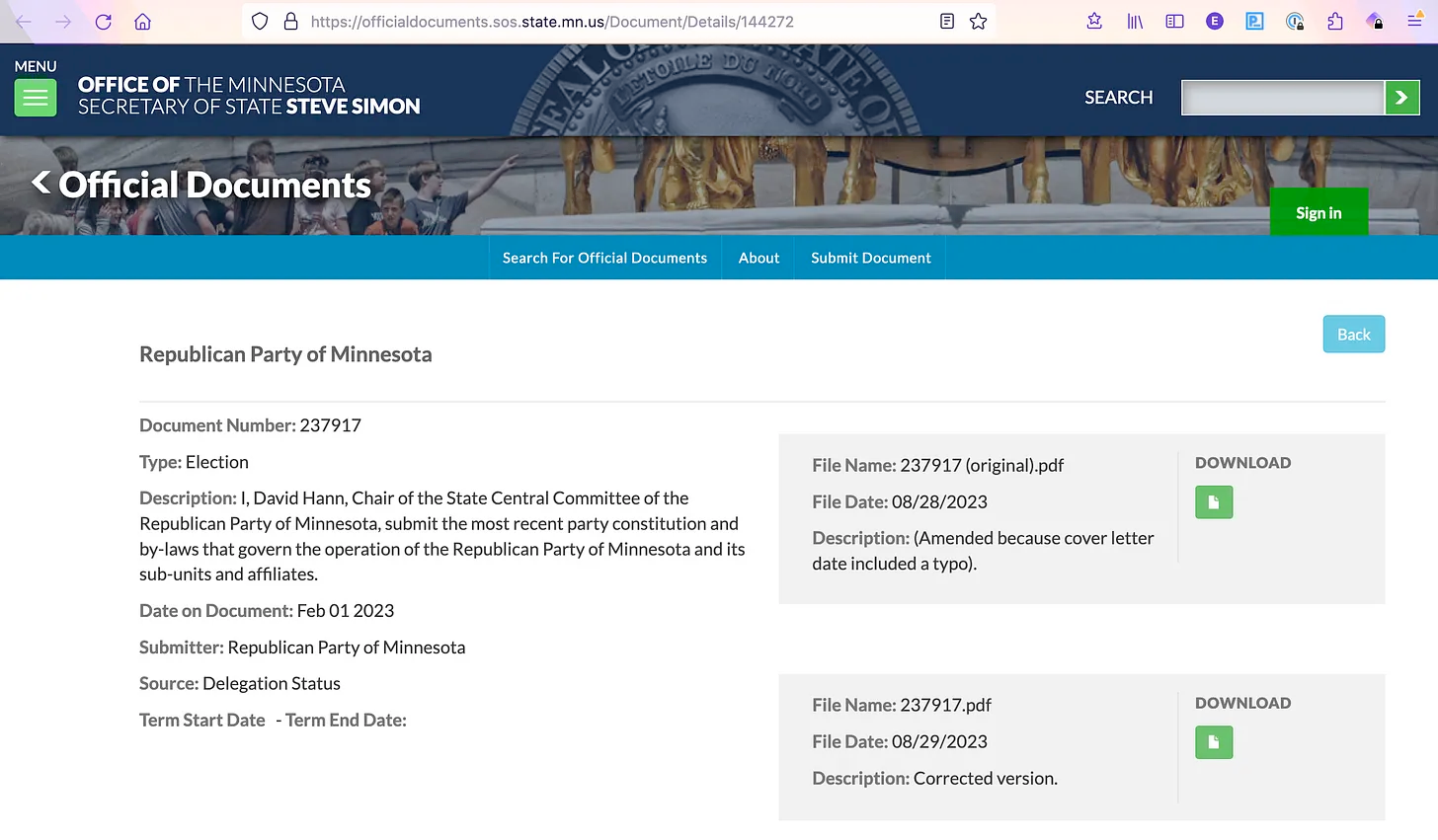 Moreover, what if, in fact, that party’s last properly adopted and filed constitution is from 1988? And what if, in fact, the same party’s 2022 constitution was not properly adopted (amendments merely adopted as a bloc)? Finally, what if, in fact, the current party Chair submitted documents to the Minnesota Office of the Secretary of State in such a way as to it appears perjure himself relating to the not-yet adopted constitution?