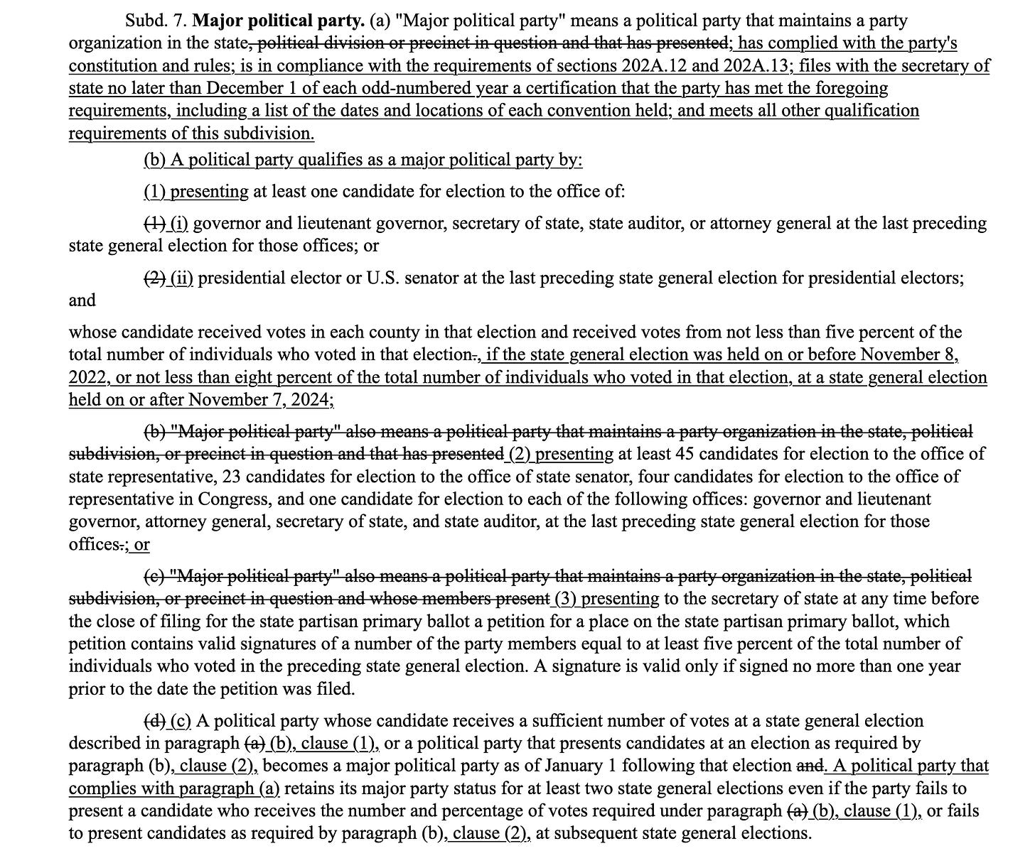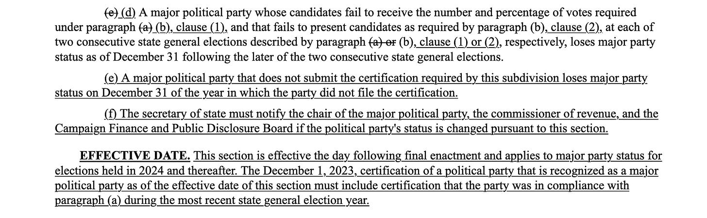 So, although there are more areas where the Minnesota Republican Party is out of compliance with its own constitution and rules (revisited later in this post), we turn now to this pressing matter where the Party is out of compliance with new reasonable legislation which could see the Party lose its major party status.