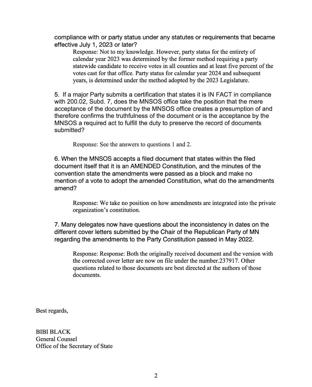 Question: Many delegates now have questions about the inconsistency in dates on the different cover letters submitted by the Chair of the Republican Party of MN regarding the amendments to the Party Constitution passed in May 2022.