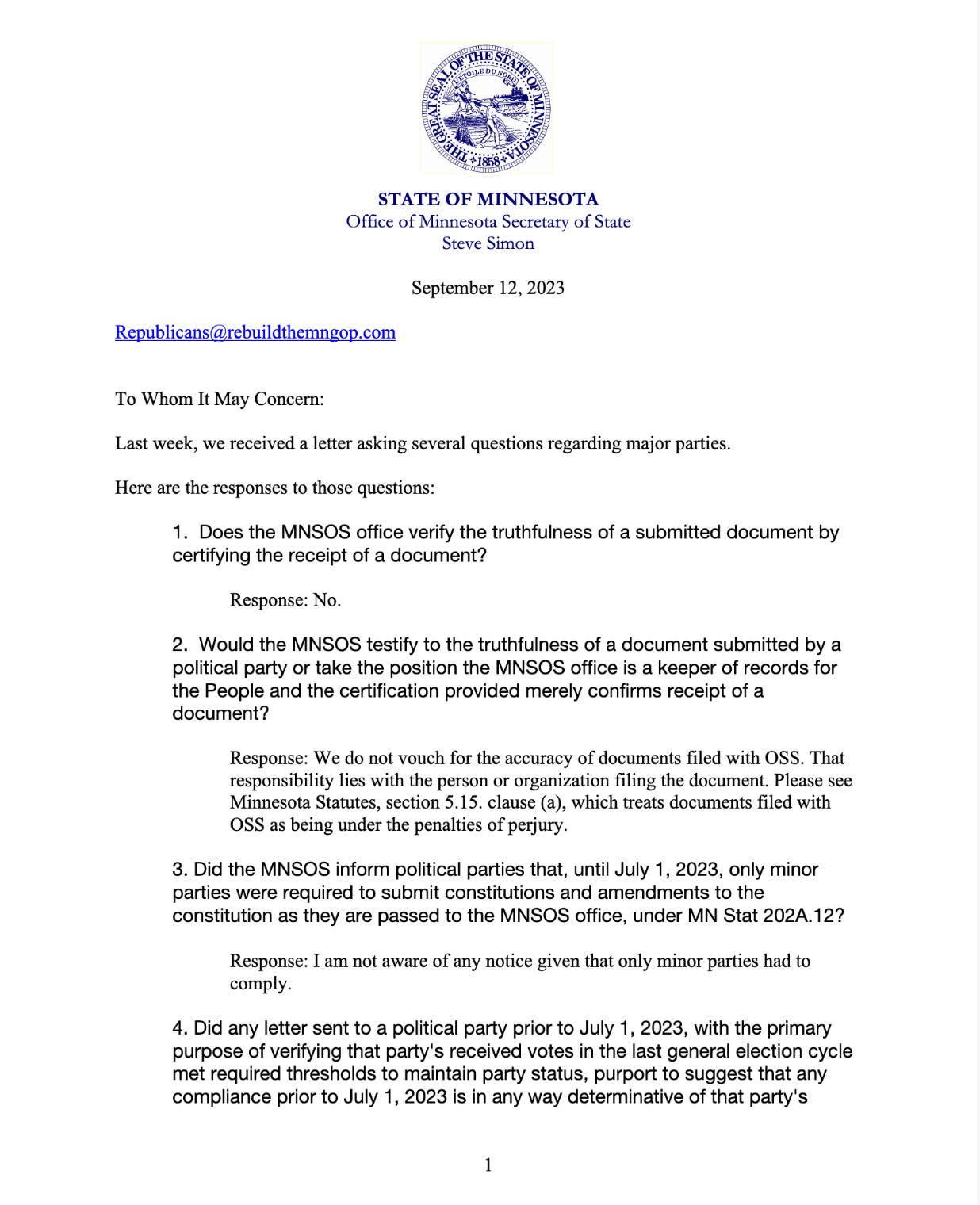 A letter was sent to the Office of the Minnesota Secretary of State inquiring about the documents submitted by the MNGOP Chair.