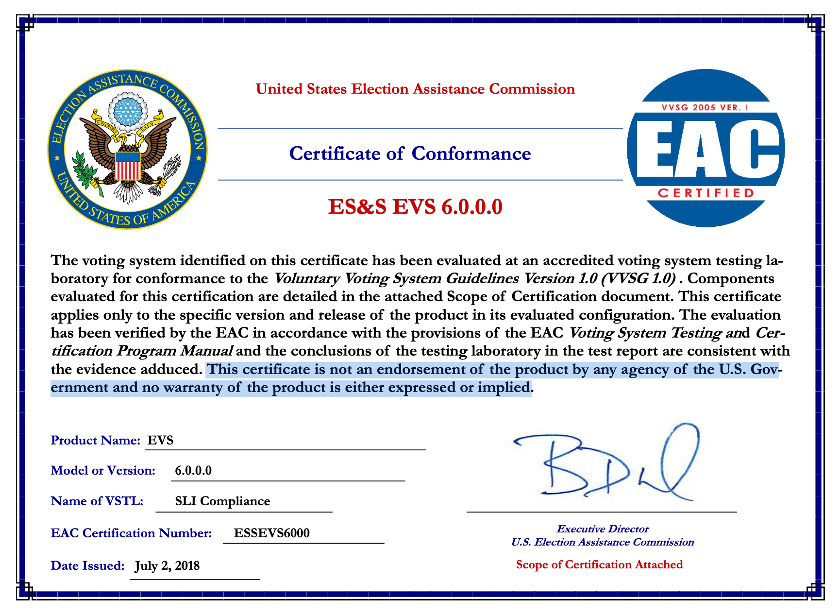 On the surface, it is to certify, from the perspective of the EAC, that its chosen voting system test lab, SLI Compliance in this case, has run the components of ES&S's products through a test plan, and that the EAC finds them in conformance with the Voluntary Voting System Guidelines 1.0, from 2005.