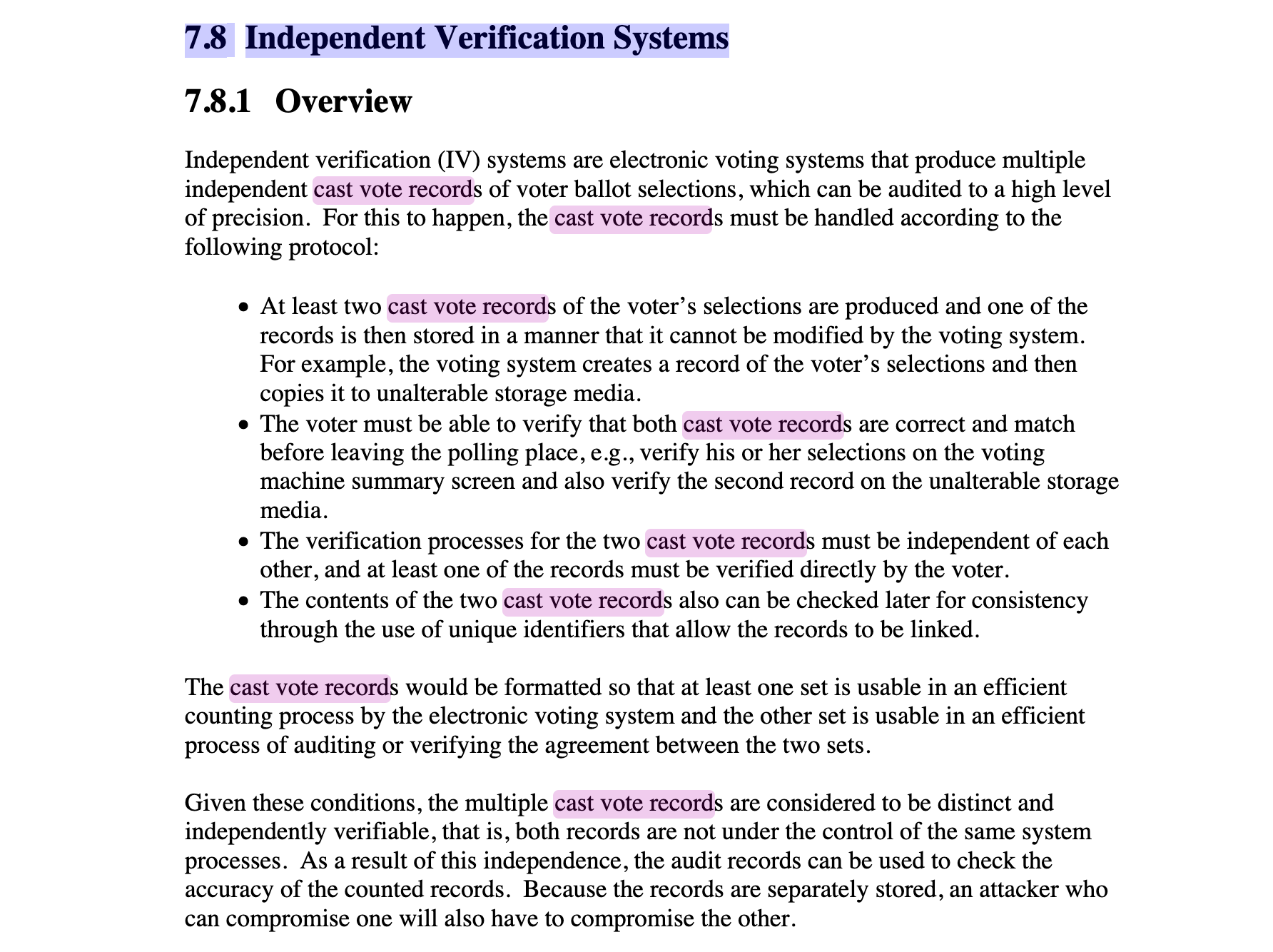 First he highlights “an electronic record of how an individual voted,” perhaps to play on unfounded fears that by publishing aggregations of votes cast that ballot secrecy will be broken. If that were true, why then would the EAC’s Voluntary Voter Guidelines (VVSG 1.0) regard cast vote records as a method of independent verification to be not optional but rather a requirement?