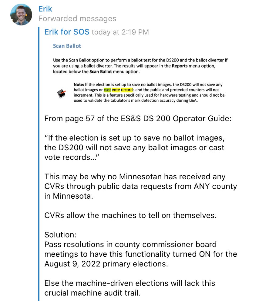 Mr. Simon also omits that the most common tabulator in use in Minnesota during the 2020 election, the ES&S DS200, to my knowledge comes out of the box with the save ballot images feature turned ON. When save ballot images is turned on, one definition of the cast vote records (the scanned image of each ballot) becomes available.