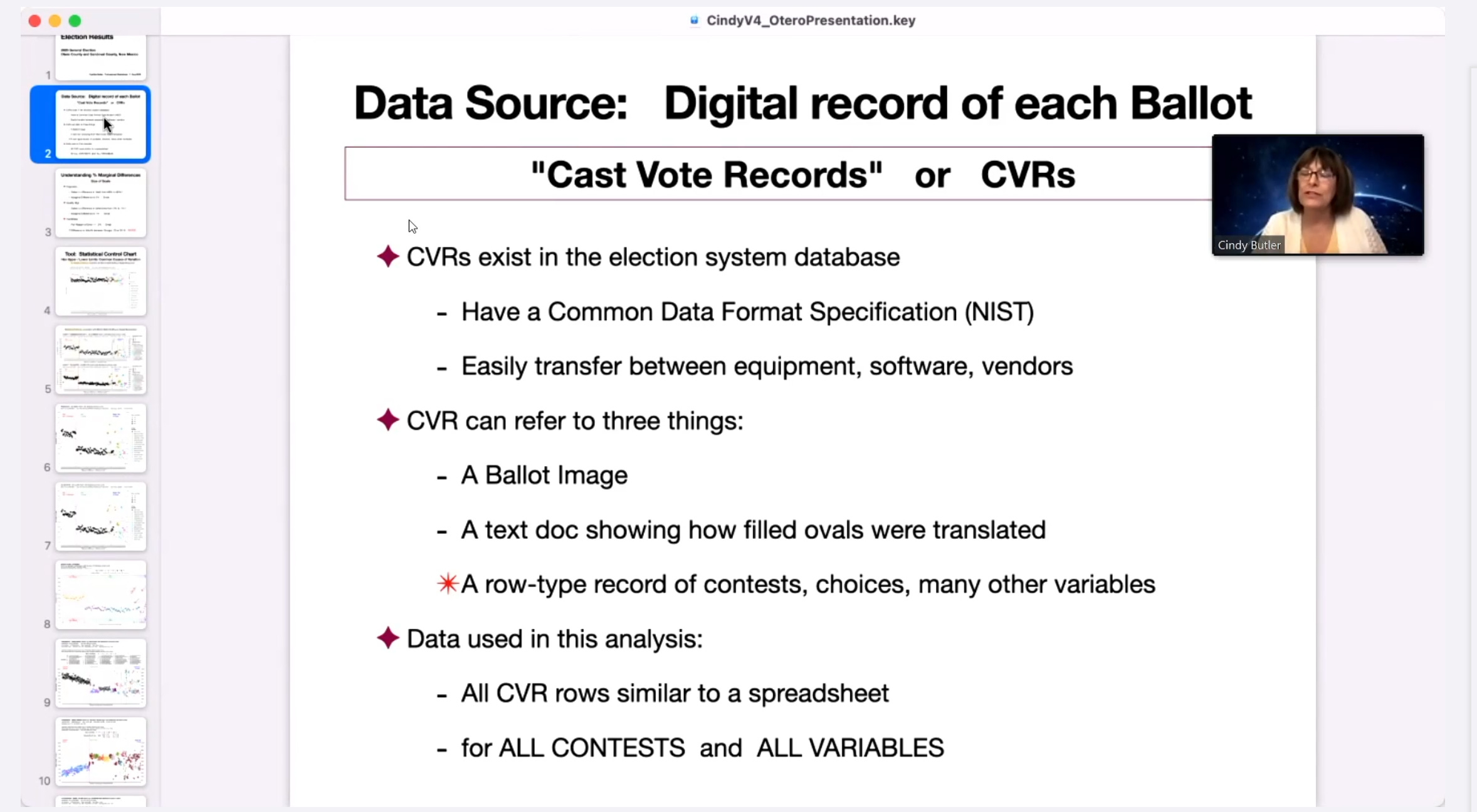 For instance, the particular kind of CVR useful for data analysis is “a row-type record of contests, choices, and many other variables” and that data is used to provide an analysis of the aggregated vote tallies by Mrs. Butler and others.