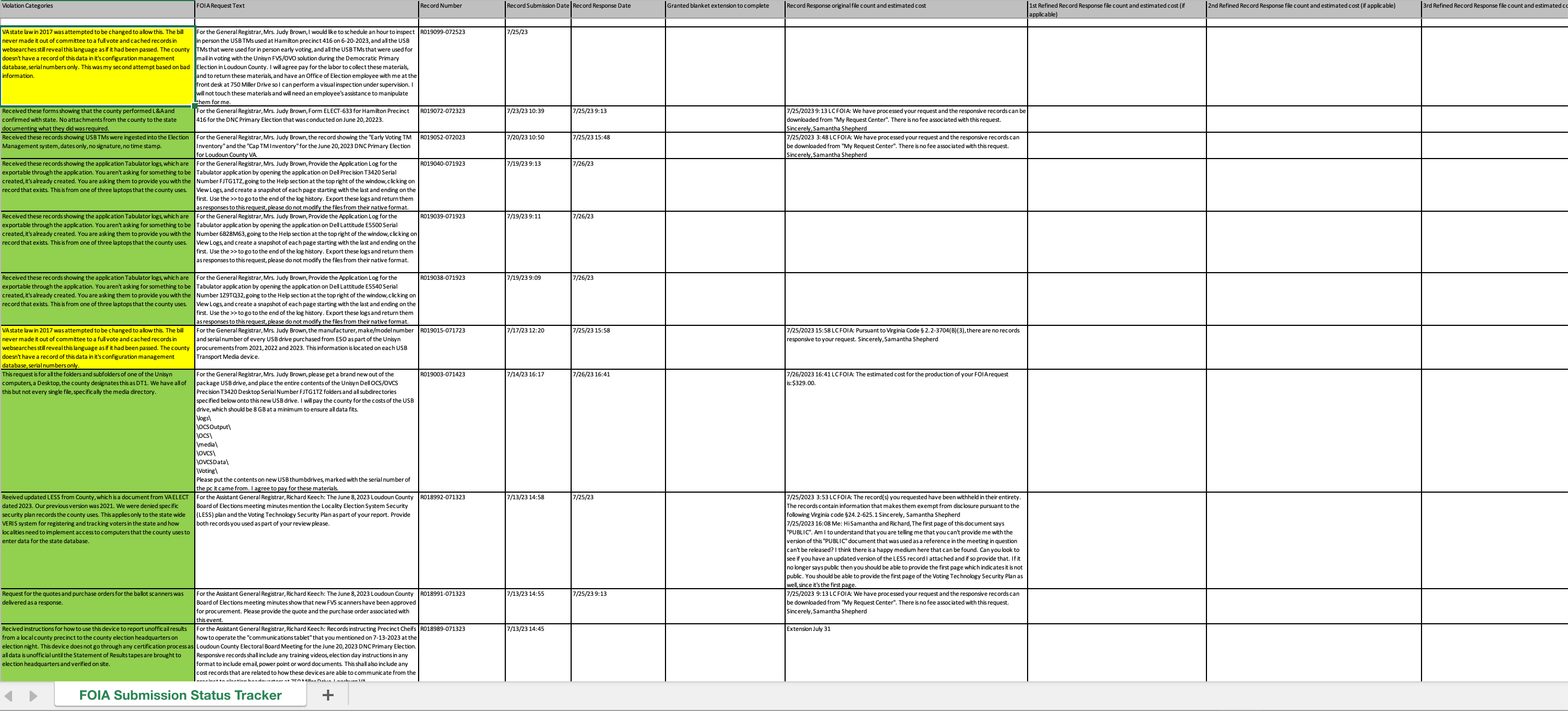 Columns: Violation Categories; FOIA Request Text; Record Number; Record Submission Date; Record Response Date; Granted blanket extension to complete; Record Response original file count and estimated cost; 1st Refined Record Response file count and estimated cost (if applicable)