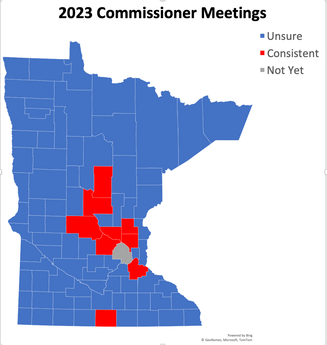 Every week the commissioner engagement map and the CVR map are updated for all 87 counties in Minnesota.