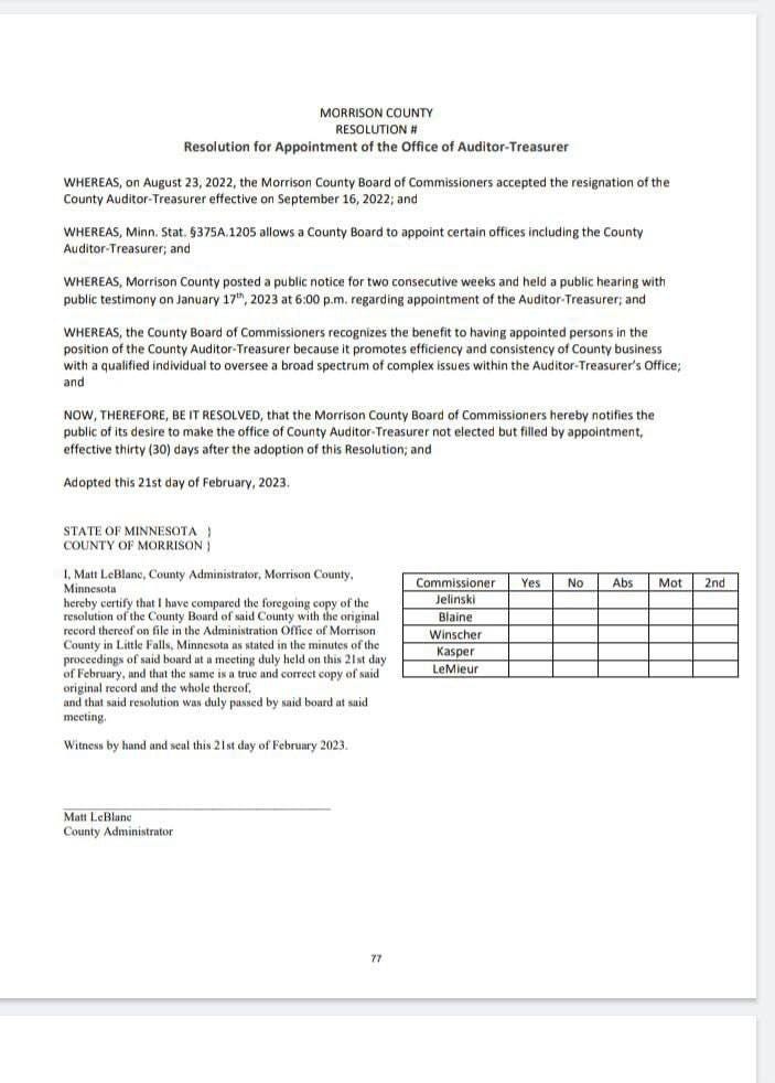 Even though residents seemed to be against the move, a resolution was drawn and voted upon about a month later in the Morrison County Commissioner Board meeting on February 21, 2023, where the resolution was tucked into page 77 of a 79-page consent agenda.