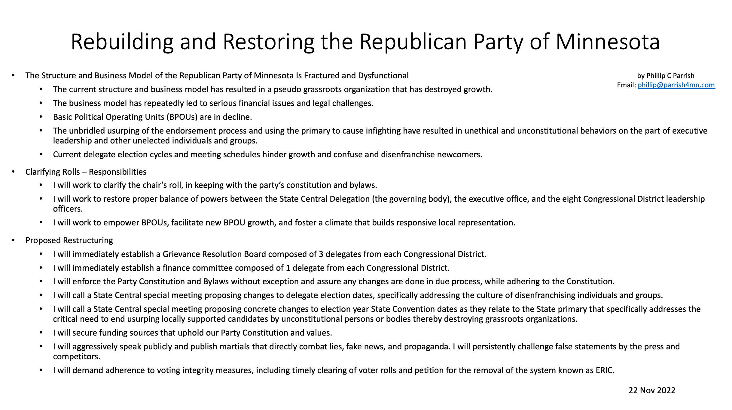 I pray you had a blessed Thanksgiving. We are 8 days away from attending to some very important business. We can and must chart a new course for the Republican Party of Minnesota. If you have not already seen it, I have attached (RestoringTheRepublicanPartyProposal) my primary statements and goals for your review.