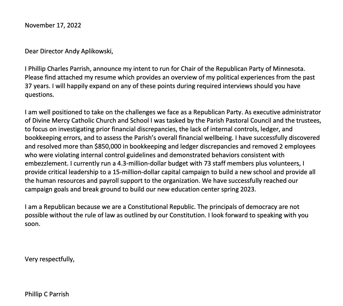 Phillip Parrish Endorsement for Chair of the Minnesota Republican Party