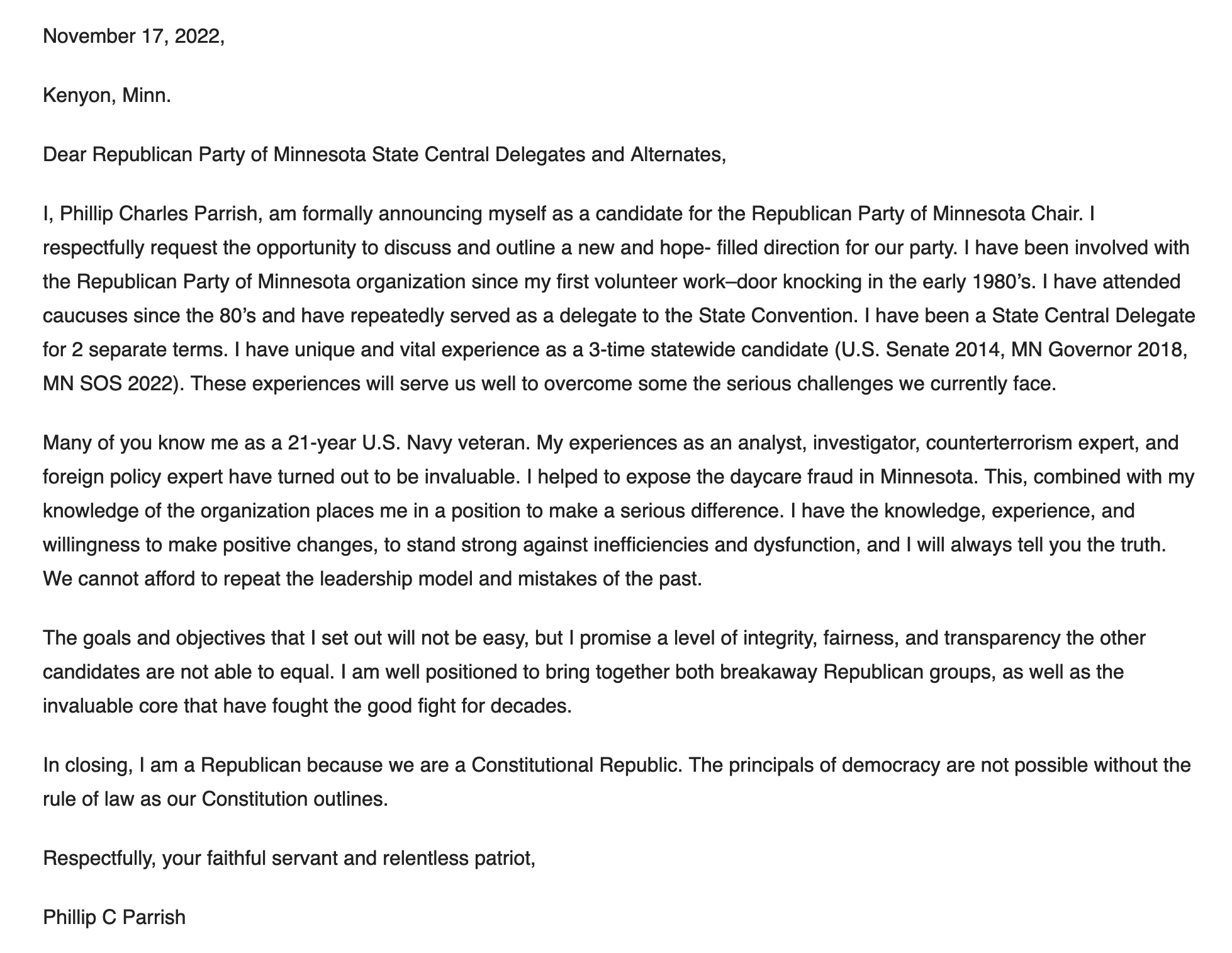 This email is official business, announcing my candidacy for Republican Party of Minnesota Chair.