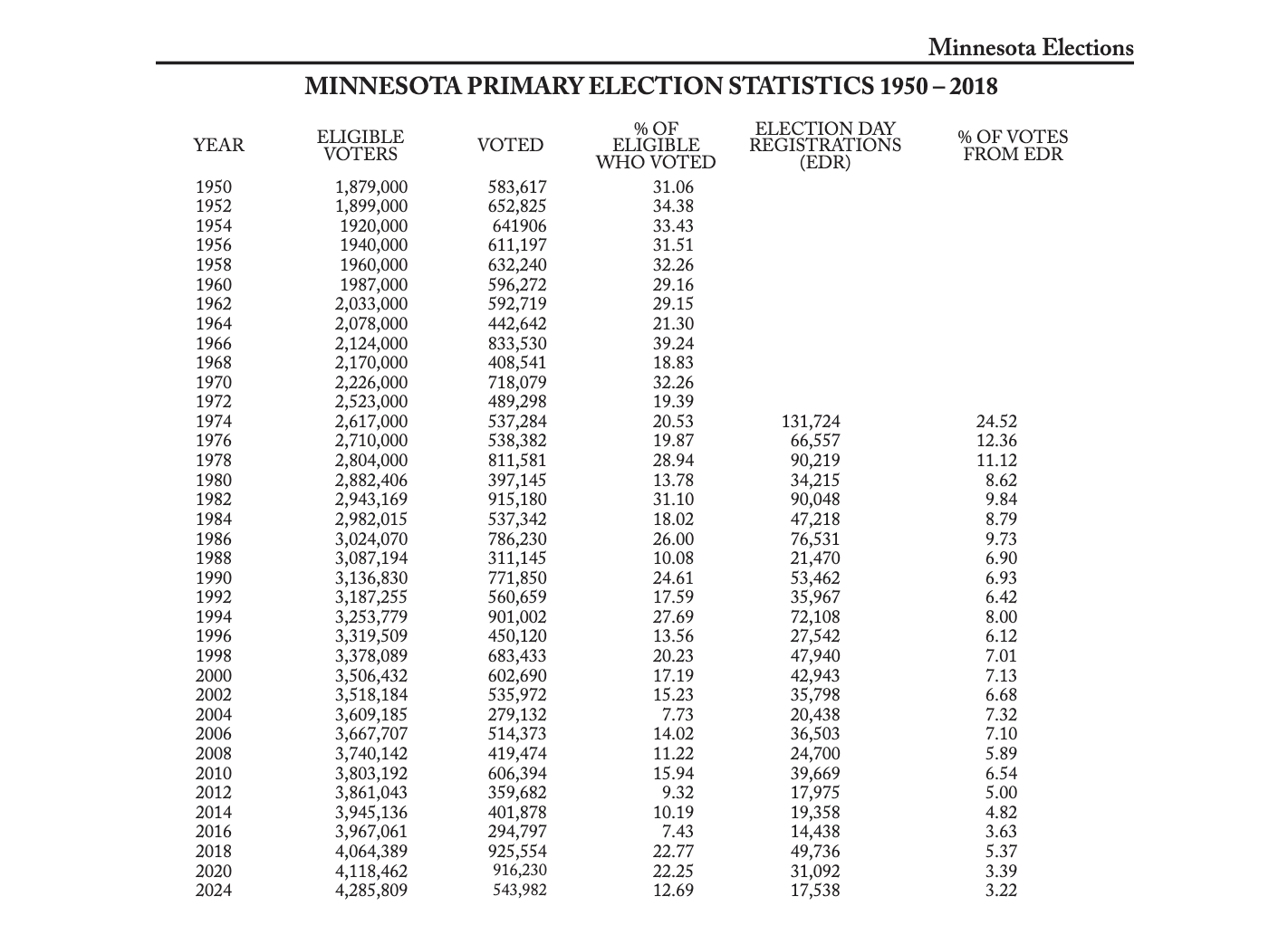 Looking at just 2020 and 2024, one may ask: How was it possible for less people to have voted (3,272,414 versus 3,292,997) while there were almost 300,000 (296,287) additional same-day voter registrations? (A separate issue is whether the most recent census is even accurate; separate from that, is 4,285,809 a realistic voting age population number from which to derive the percent of eligible voters?)