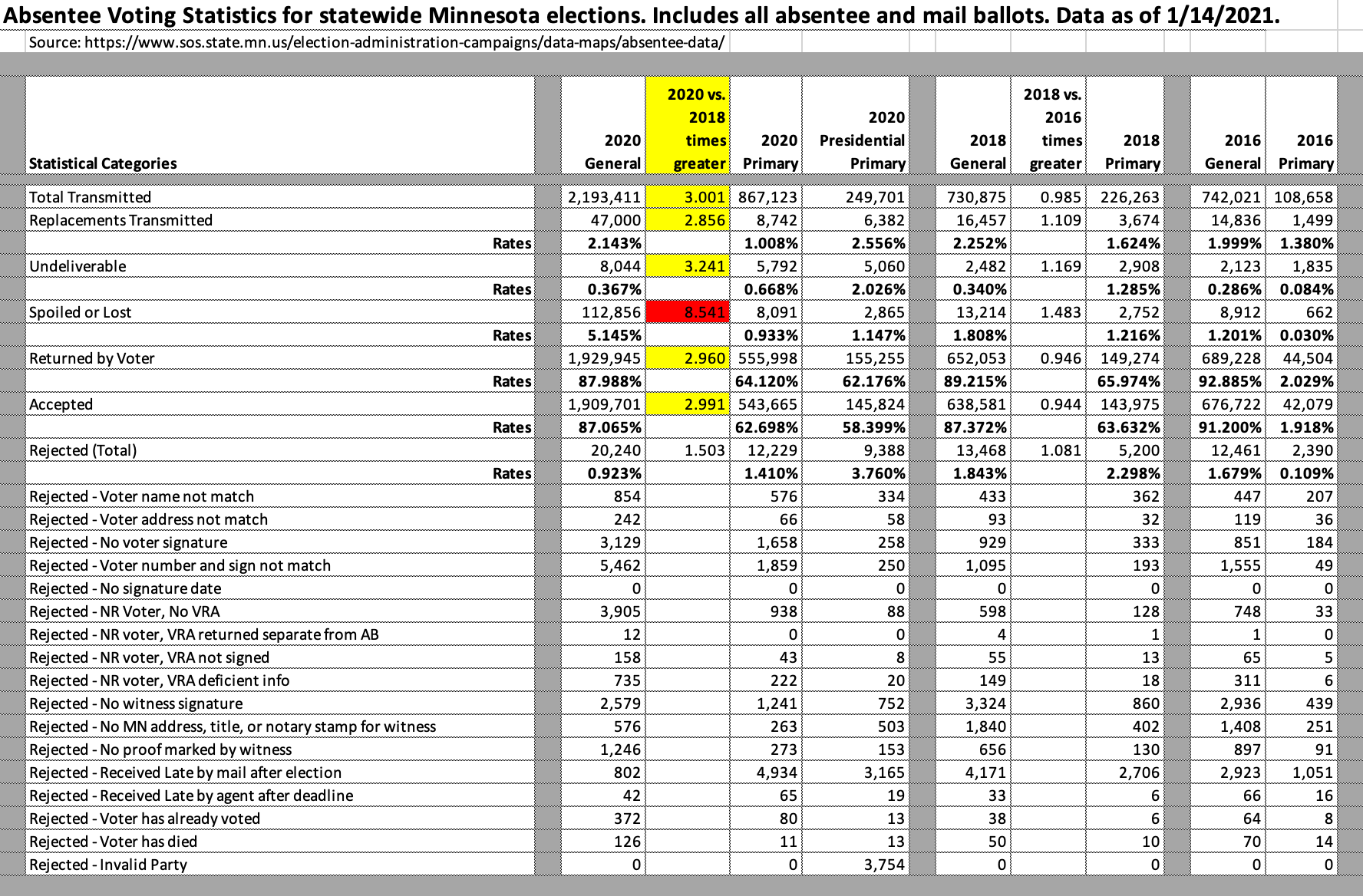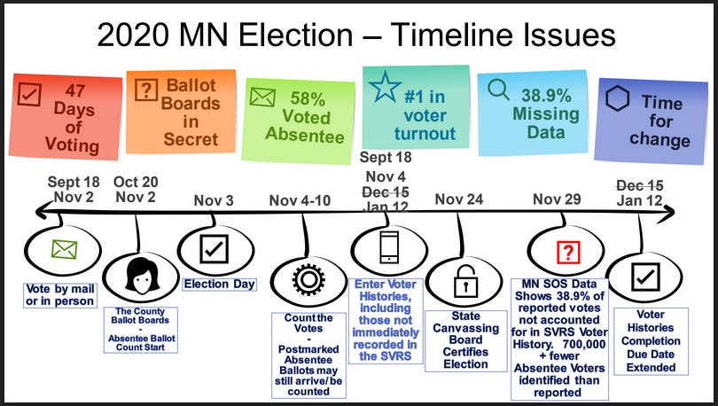 Rick Weible has shown that more than 700,000 absentee ballots were not connected with a voter in the Statewide Voter Registration System (SRVS) as they should have been on November 29th, 2020, only five days after the Canvassing Board certified Minnesota's election on November 24th, 2020. Should the Canvassing Board have certified Minnesota's election before this work, as indicated by the election laws and statutes, was complete? Since the Secretary of State has access to all this data and correspondence with the county clerks, there should be no problem in providing an explanation. And yet to my knowledge none has yet been given.