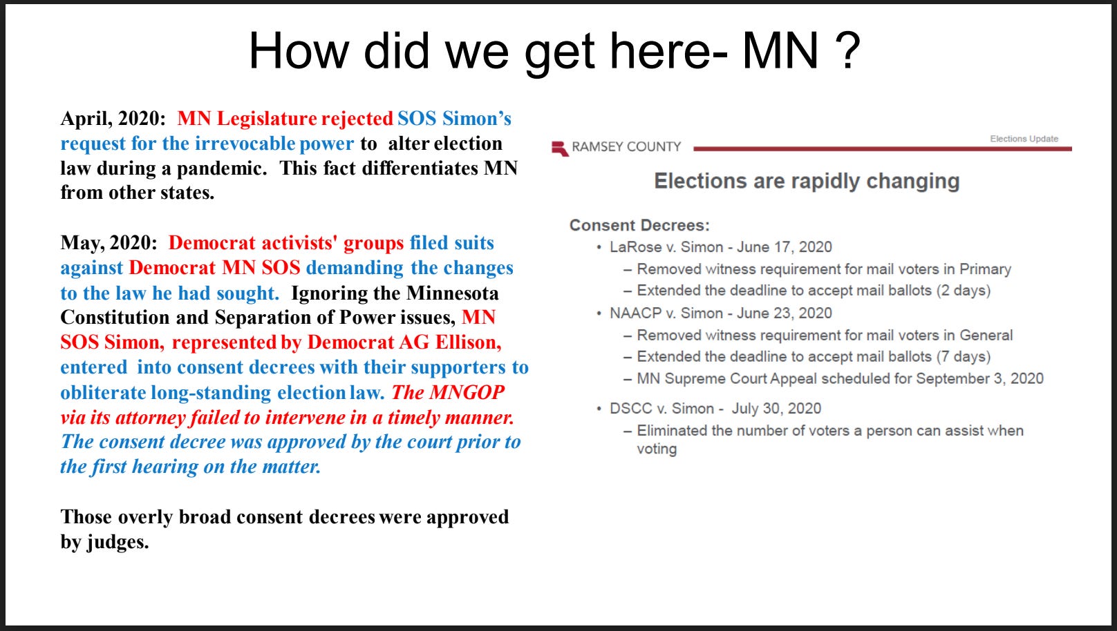 Also relevant in the preparation category is the recent January 4th, 2022 Supreme Court hearing in Minnesota Voters Alliance, et al. v. County of Ramsey, et al. Regarding the case, on which the MN GOP Chairman David Hann stated: