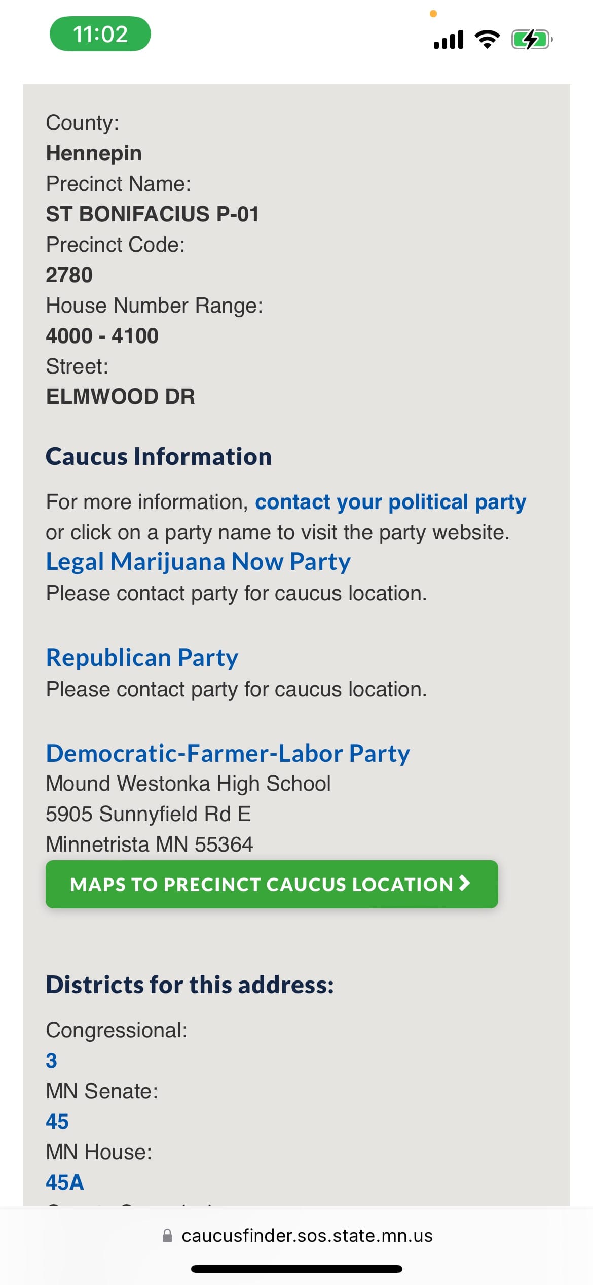 Meanwhile, Rick Weible was able to share this screenshot from the Secretary of State's website, which shows that for his old address, the DFL caucus location is listed, but the GOP's is not.