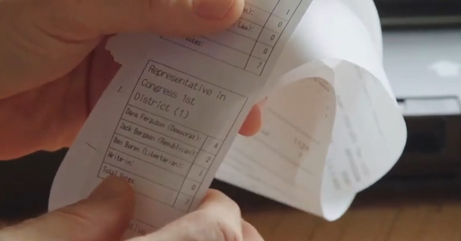 A summary tape that looks like a restaurant receipt is printed out of the tabulator and the judges are verifying that the total number of ballots that went into the machine are still there and that the total number of ballots equals the total vote tallies. Nothing to check or audit that the machine tallies would equal a hand tally, since no hand tally is done.